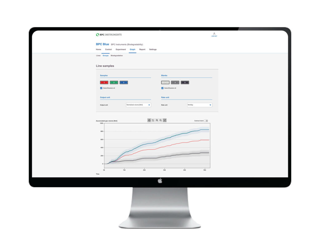 借助BPC Blue集成的Aurora軟件,您可以實時監測生物降解過程,并在線操作降解性的計算。這包括氣體量數值、標準偏差、負對照的消除以及計算得到的百分比生物降解率。結果會以科學直觀的圖表形式呈現,極大地提升了檢測和數據分析效率和整體的用戶體驗。